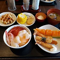 오른쪽 벽을 따라서는 에그 스크램블, 베이컨, 소시지, 토스트 등 현대식 호텔에서 흔히 볼 수 있는 조식 메뉴가 준비되어 있었고 왼쪽에는 홋카이도에서 공수한 싱싱한 해산물과 야채로 이뤄진 현지식 부페가 손님들을 맞이하고 있었습니다.